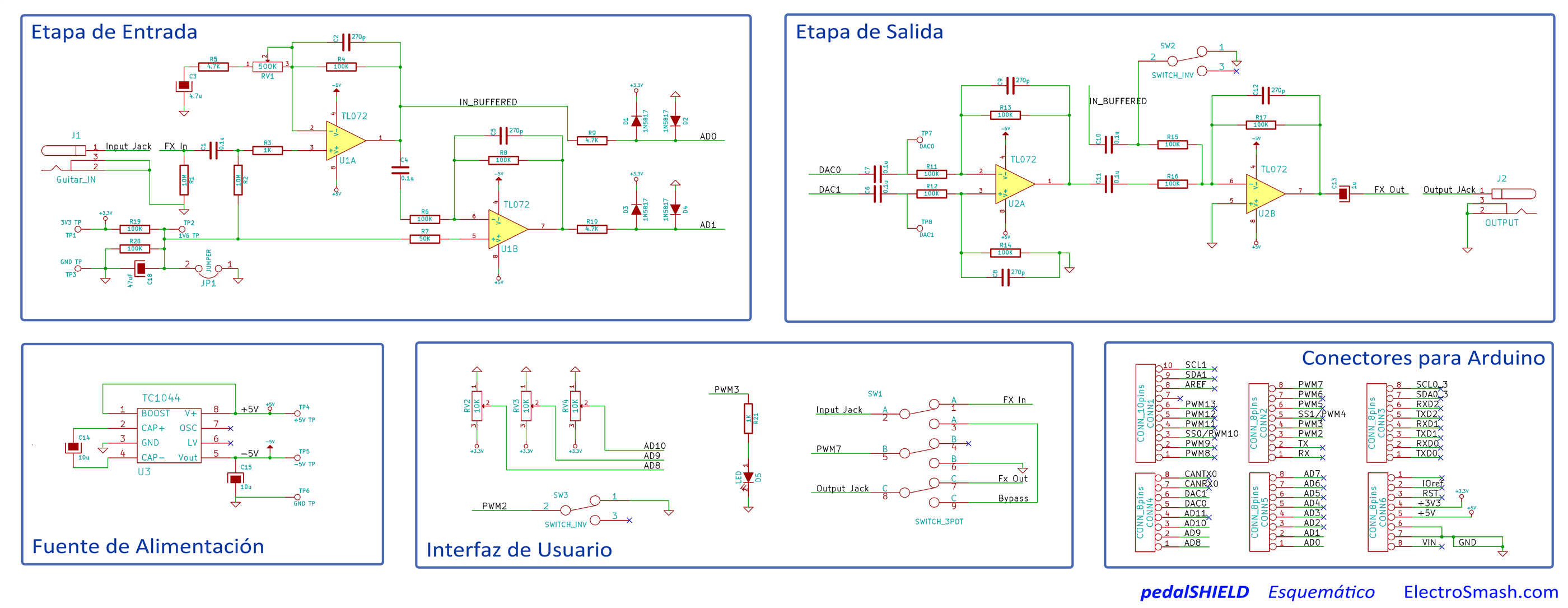El diseño ha sido realizado con KiCad, una herramienta gratuita/open-source para la creacíon de diseños electrónicos. Los ficheros nativos de los esquemáticos y la lista de componentes son completamente públicos. El circuito se divide en 5 bloques principales: Fuente de Alimentación, Etapa de Entrada, Etapa de Salida, Interfaz de Usuario y Conectores con Arduino: